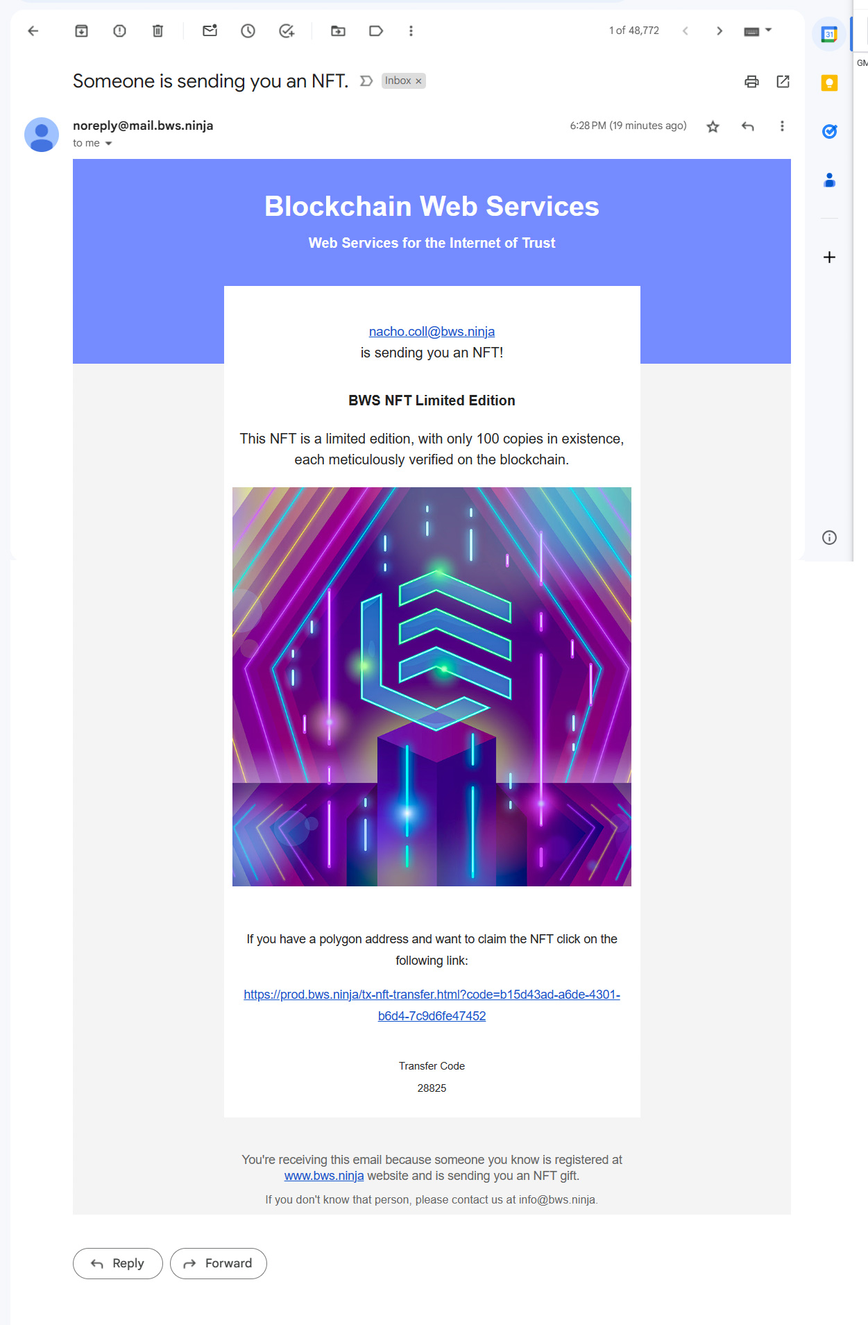 Email received for the new NFT owner to hold and get ownership