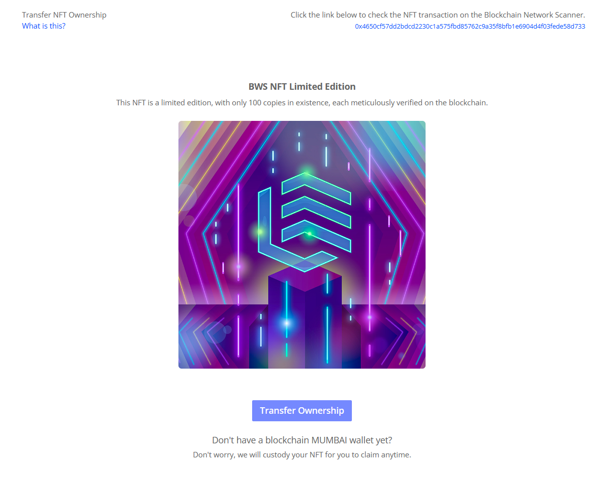 Before you transfer your NFT, we will do the custody, and ownership is mapped with your BWS Account.
