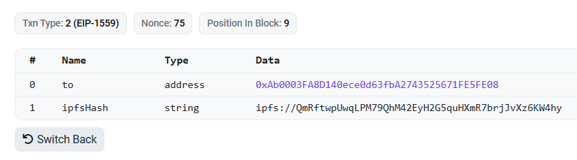 }Your NFT blockchain transaction then points to IPFS, as you can see on the following example: